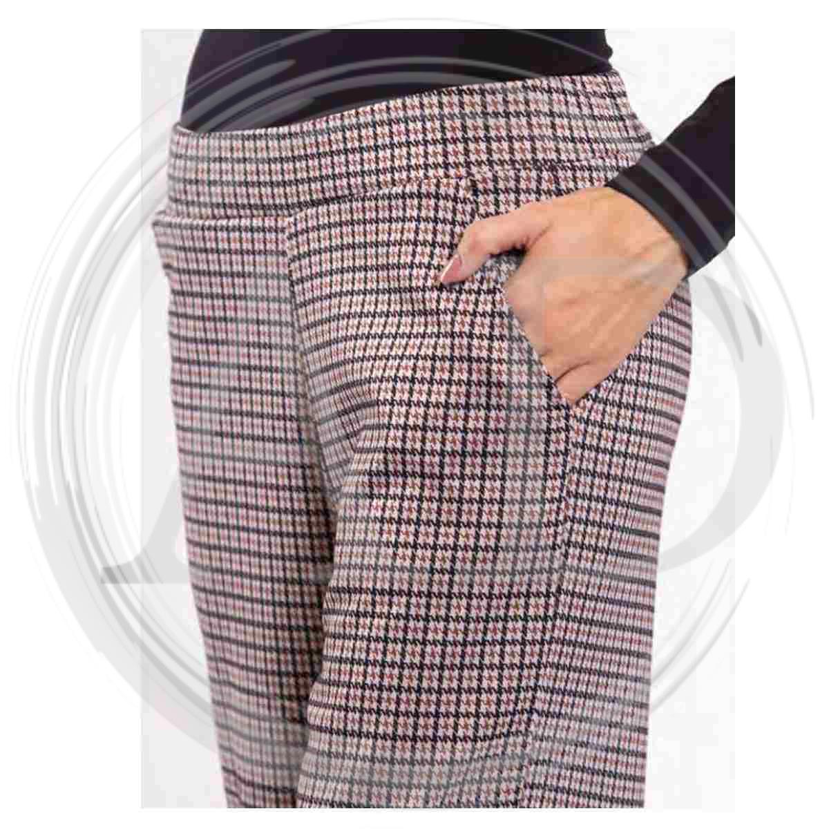 Modello palazzo a fantasia con elastico in vita e tasche laterali, realizzati in morbida maglia jacquard elasticizzata soft touch, effetto lana.